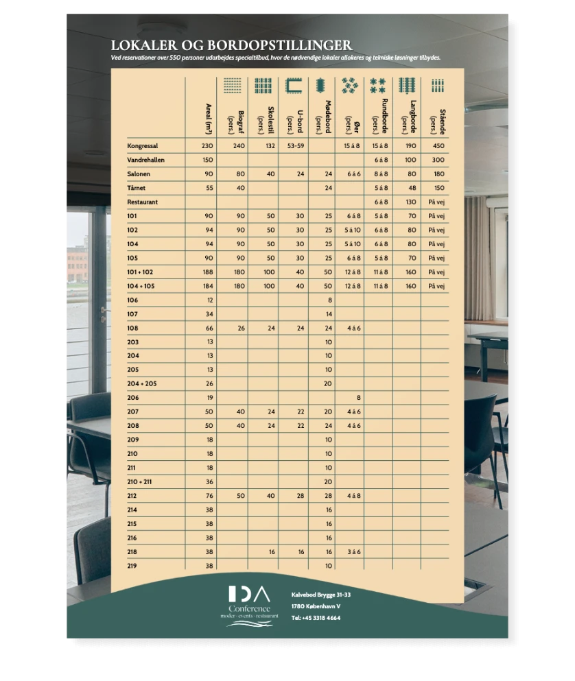 Hos IDA Conference får du mere end bare et mødelokale eller festlokale – du får en totaloplevelse. Fra vores erfarne eventkoordinatorer, der hjælper dig med at planlægge hvert minut af dit arrangement, til vores dedikerede serveringspersonale, der sørger for, at alle dine gæsters behov er opfyldt – vi har fokus på detaljerne, så du kan fokusere på at skabe mindeværdige øjeblikke.